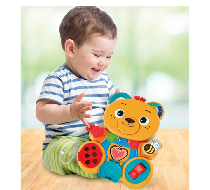 Grazie alla presenza di materiali diversi l'orsetto stimola la sensorialità, guidando il bambino nell'imparare a manipolare oggetti di vita quotidiana.