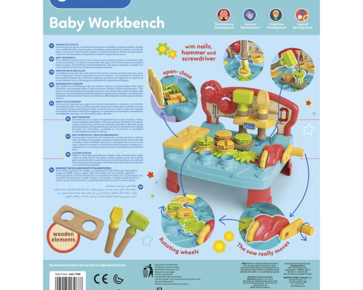 Un banchetto Montessori per giocare con diversi attrezzi da lavoro.