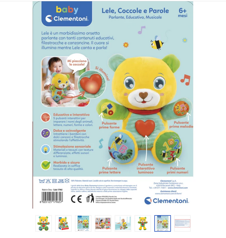 Lele è un morbidissimo orsetto parlante con tanti contenuti educativi, filastrocche e canzoncine.